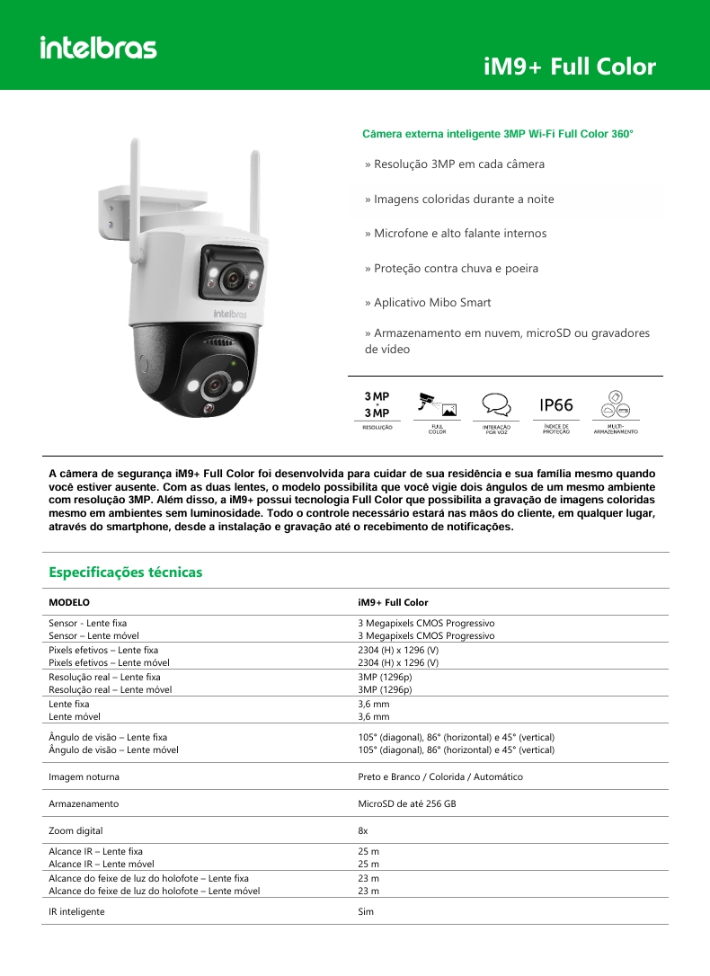 A iM9+ Full Color apresenta uma solução ainda mais abrangente, unindo duas câmeras em um único dispositivo. As lentes trabalham em conjunto para expandir a área monitorada, proporcionando uma visão completa¹ de todo o ambiente.